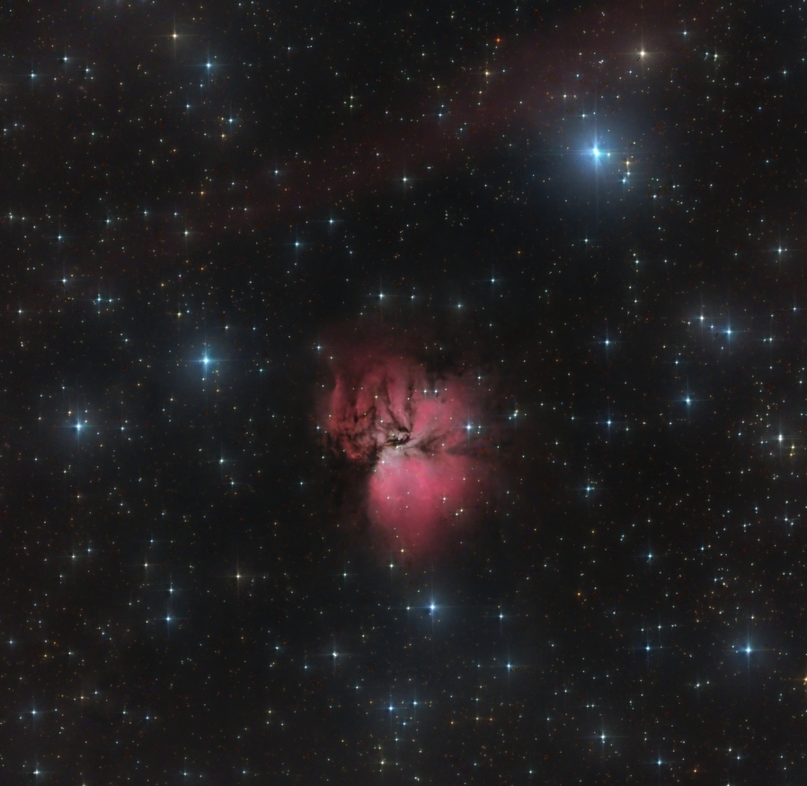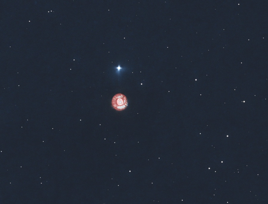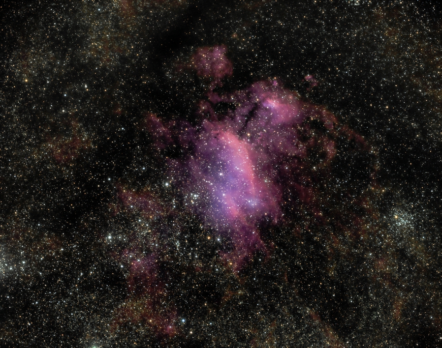 15 prises de 600s en HSO, combinaison de OHS (OIII rouge, Halpha vert, SII bleu), Traitement Pixinsight